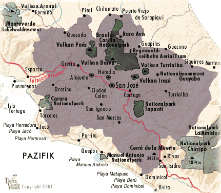 die Städte San José, Heredia, Alajuela, Cartago und Turrialba,